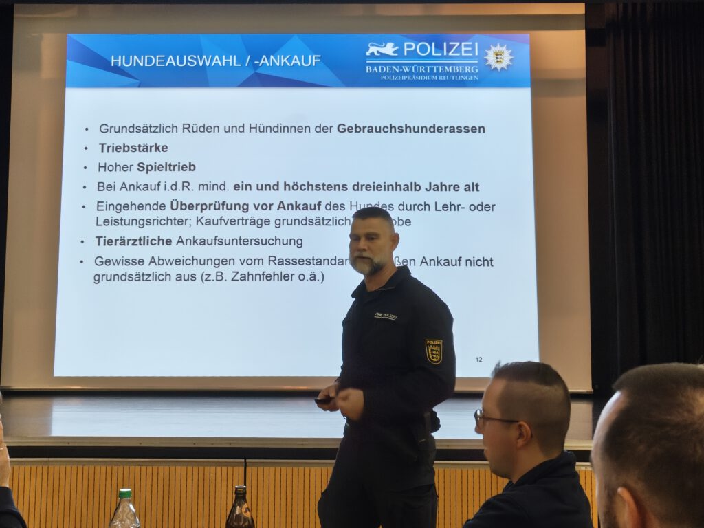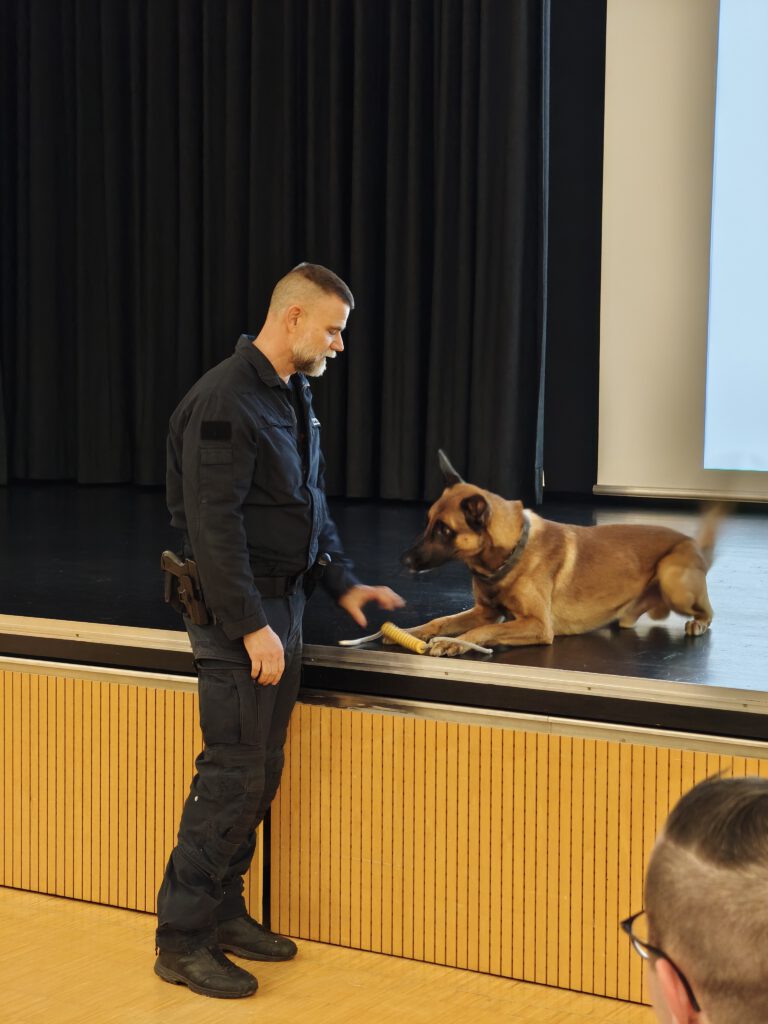 Herr Fischer gab uns einen spannenden Einblick in die Ausbildung und die vielfältigen Fähigkeiten der Hundestaffel. Dabei erfuhren wir auch, welche Besonderheiten bei gemeinsamen Einsätzen mit der Polizeihundestaffel zu beachten sind.